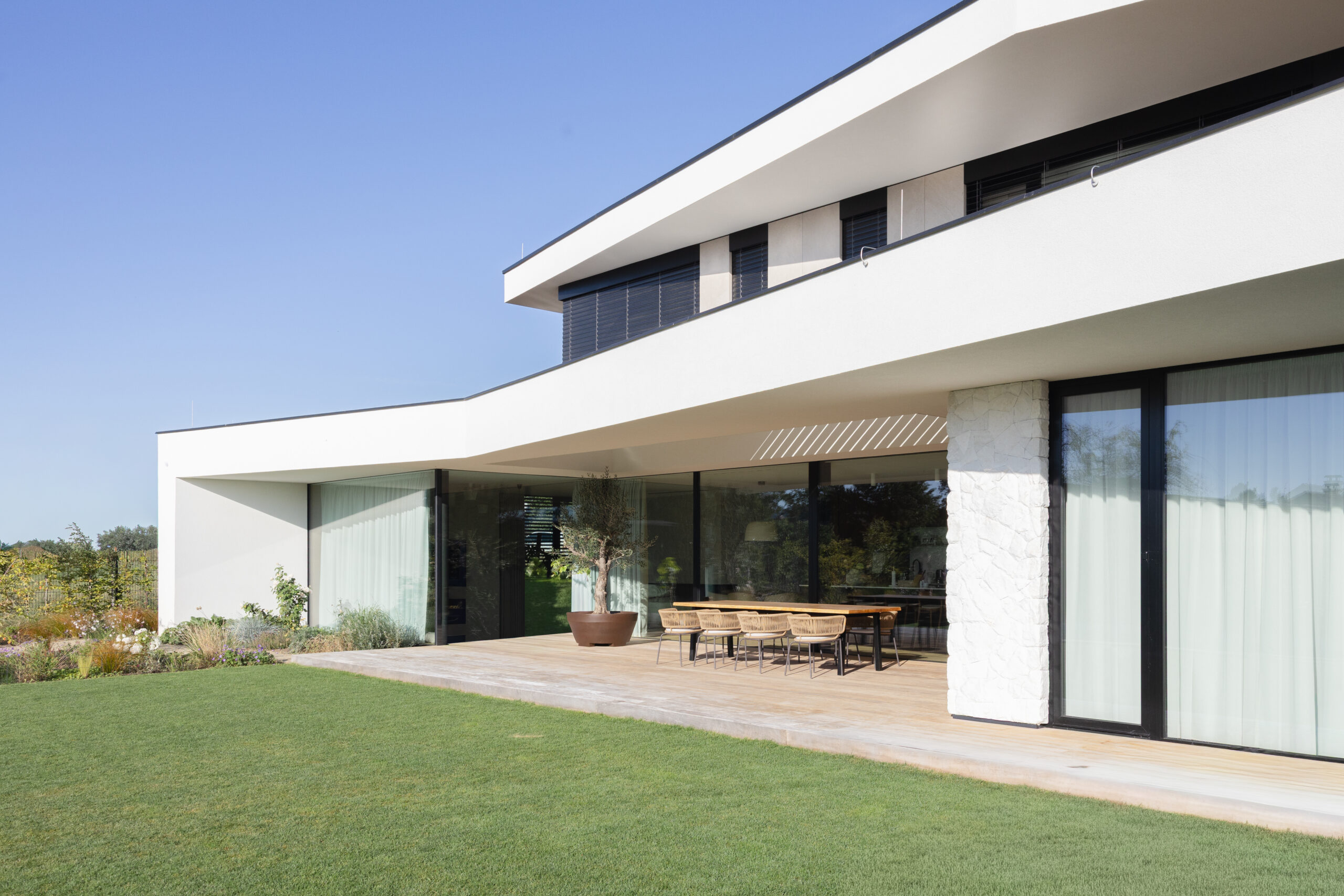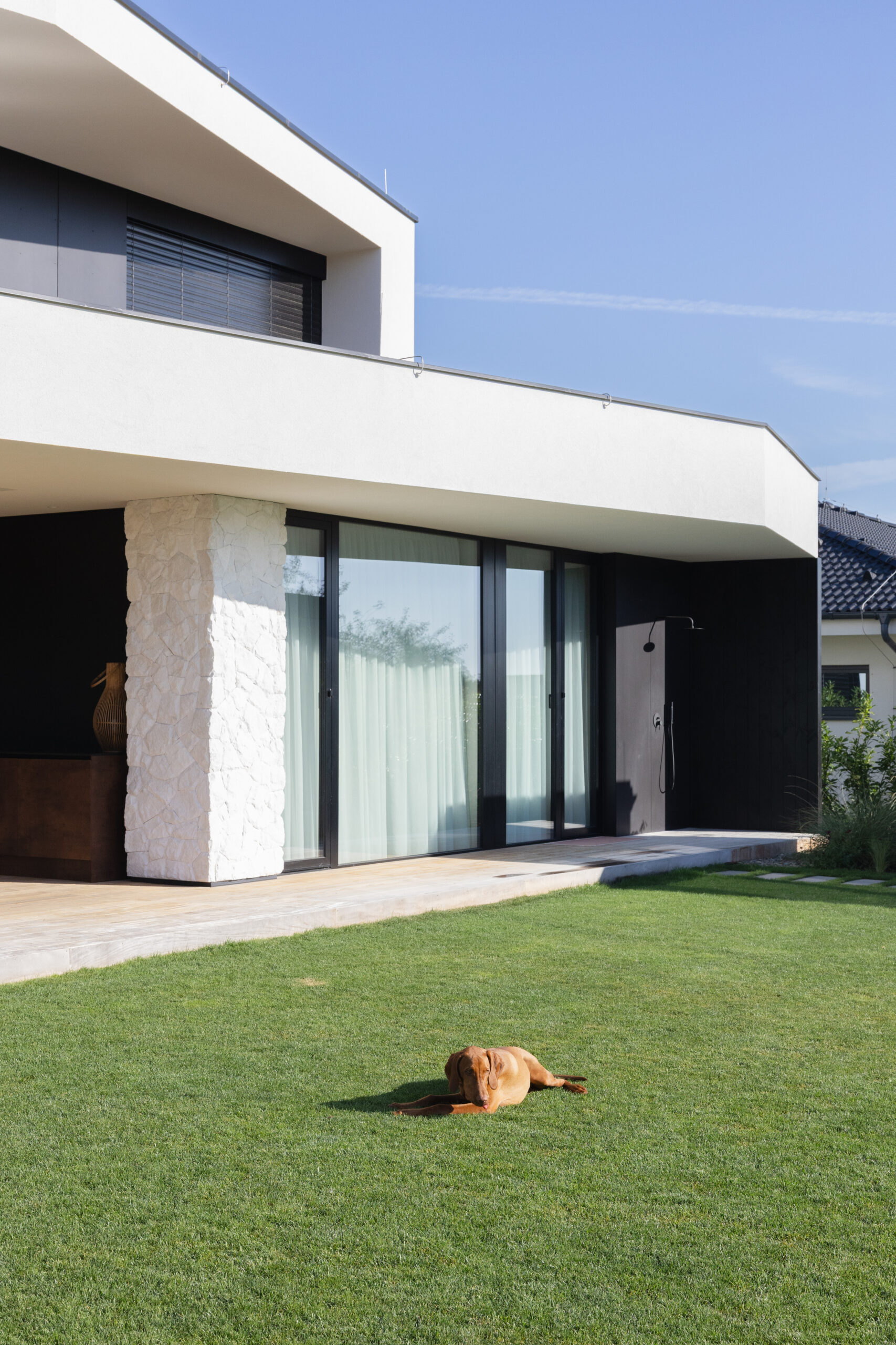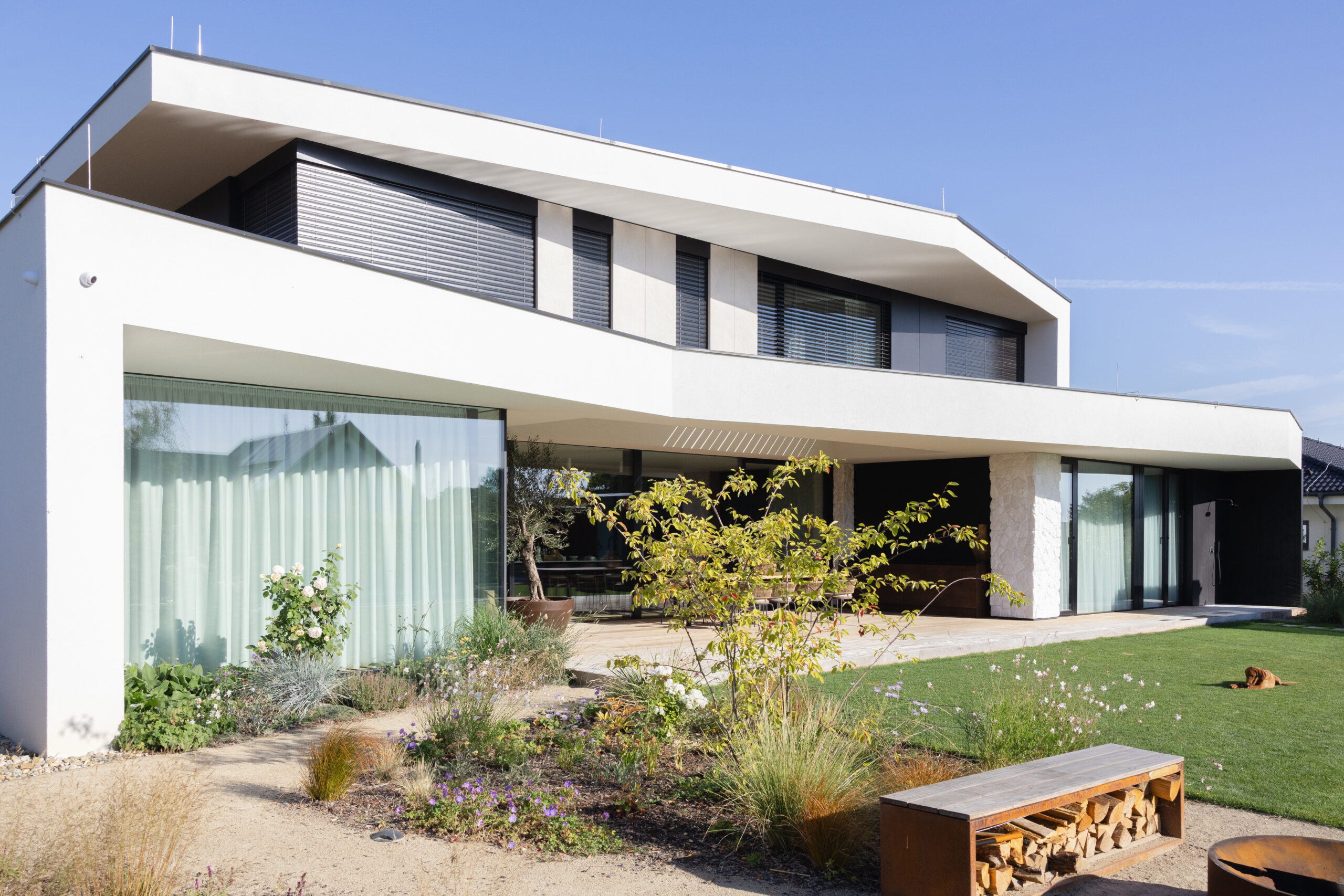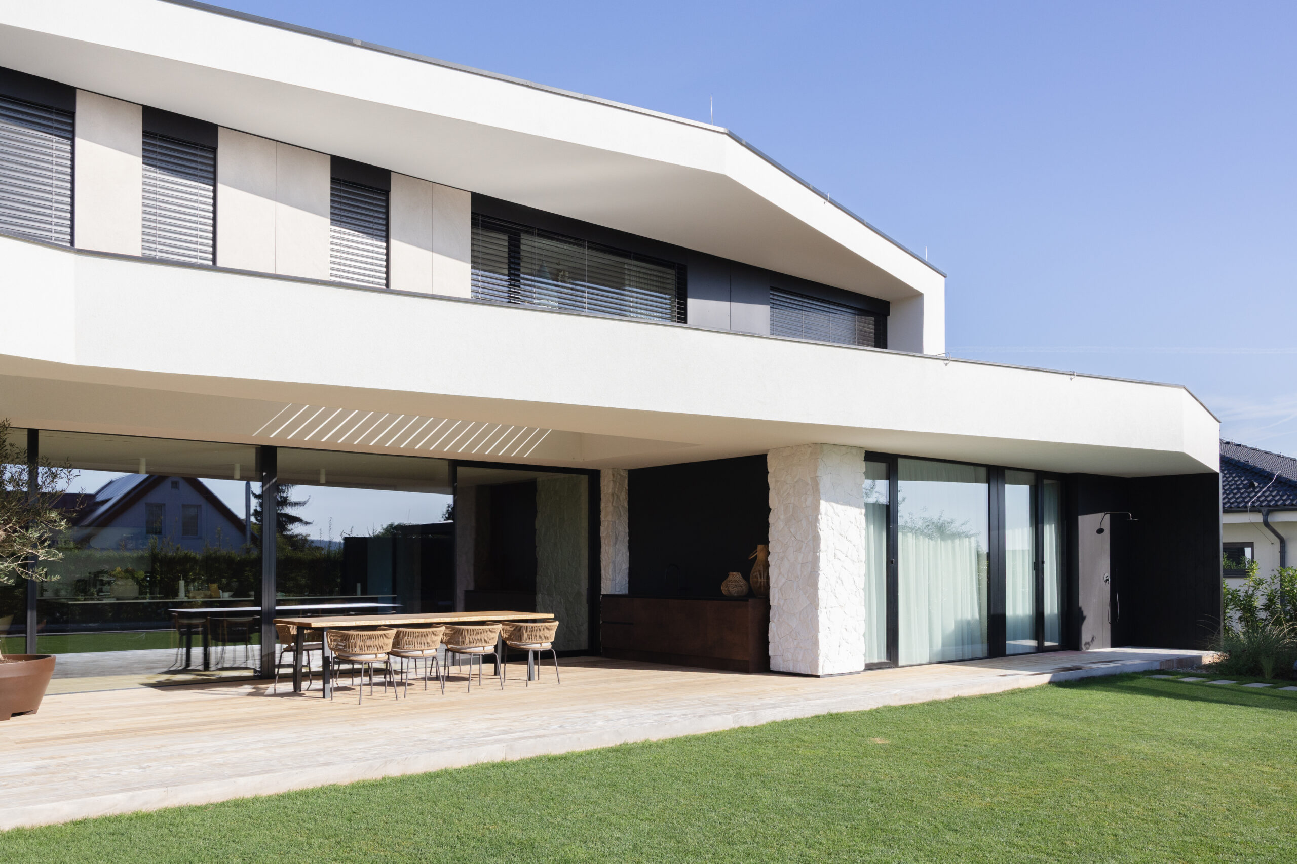 Dominantní architektonické linie, rozsáhlé prosklené plochy a propojení interiéru s exteriérem vytvářejí harmonické a světlé prostředí. Na stavbě jsme využili kombinaci moderních materiálů – pohledového betonu, hliníku a přírodního kamene, které společně podtrhují luxusní charakter domu.