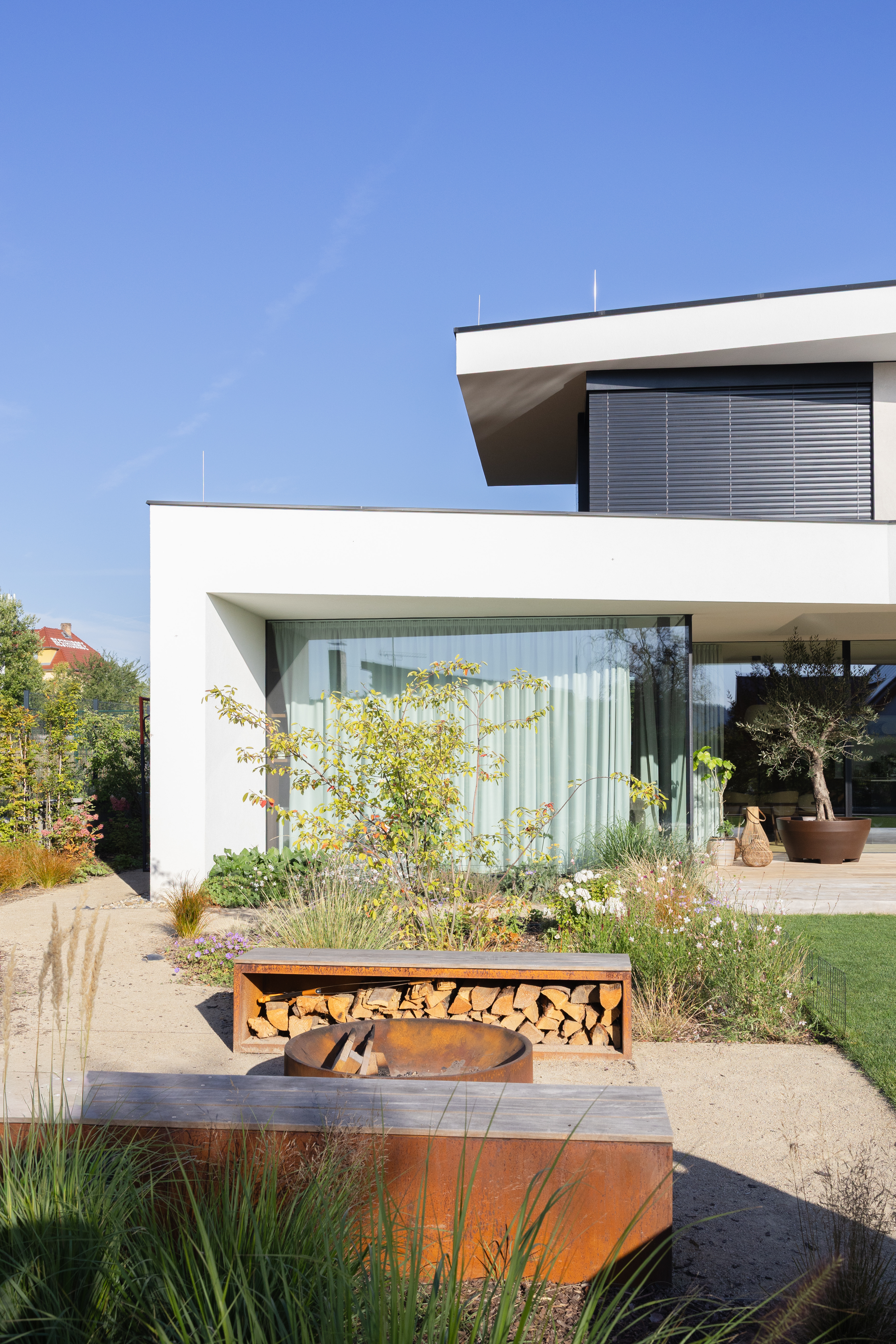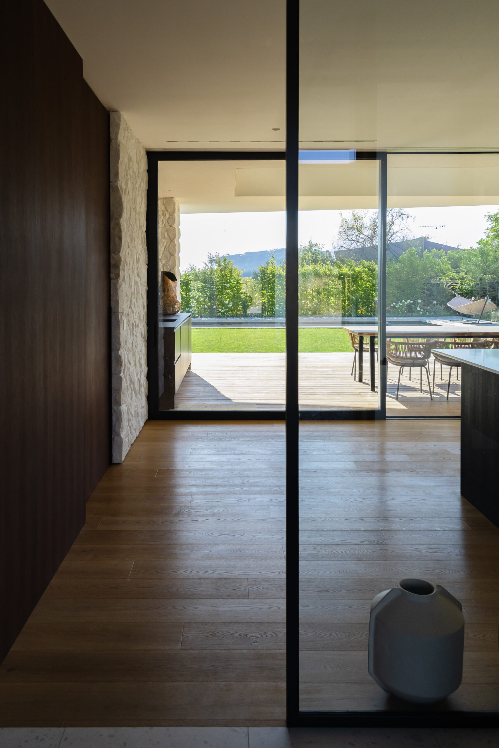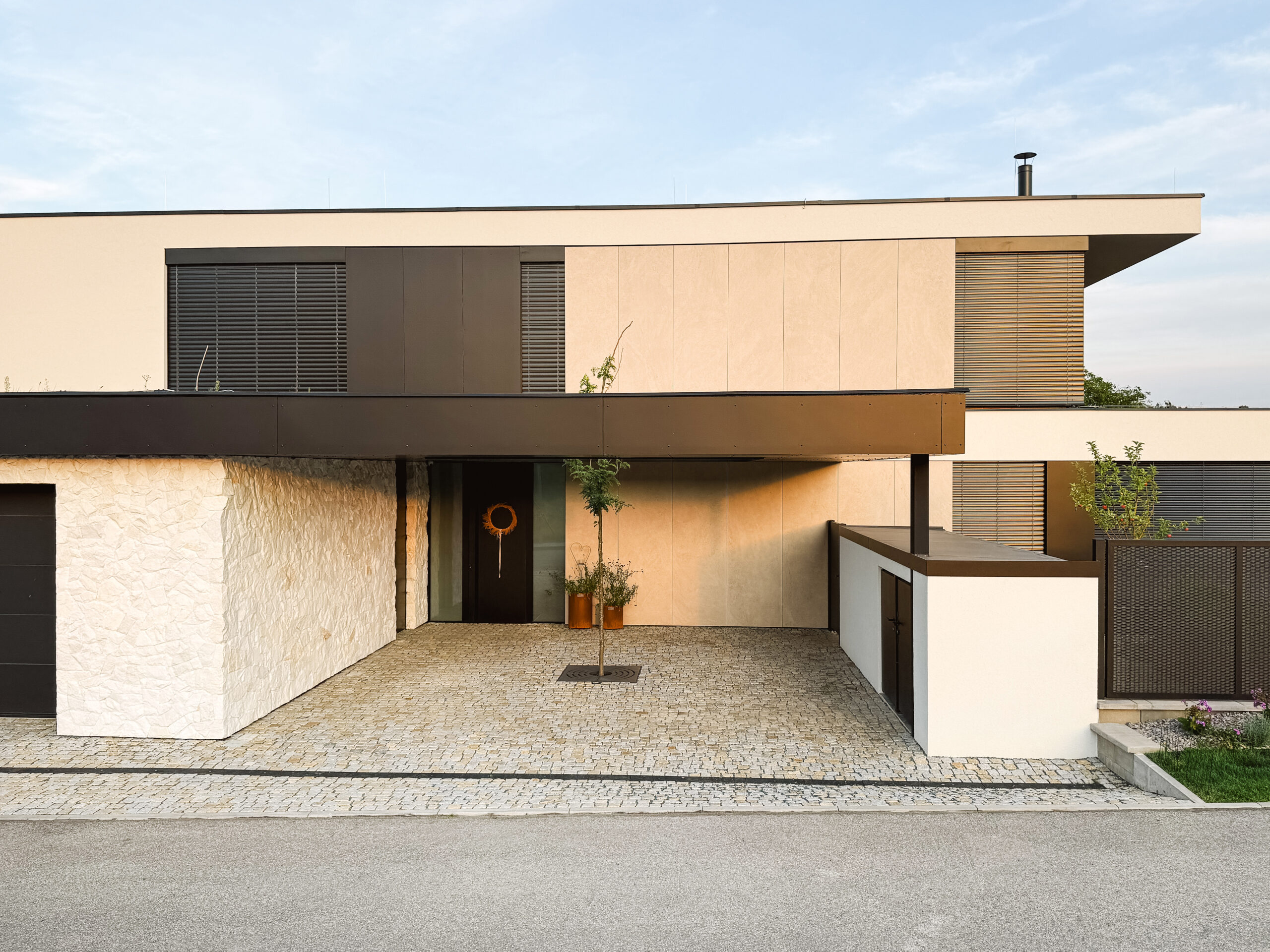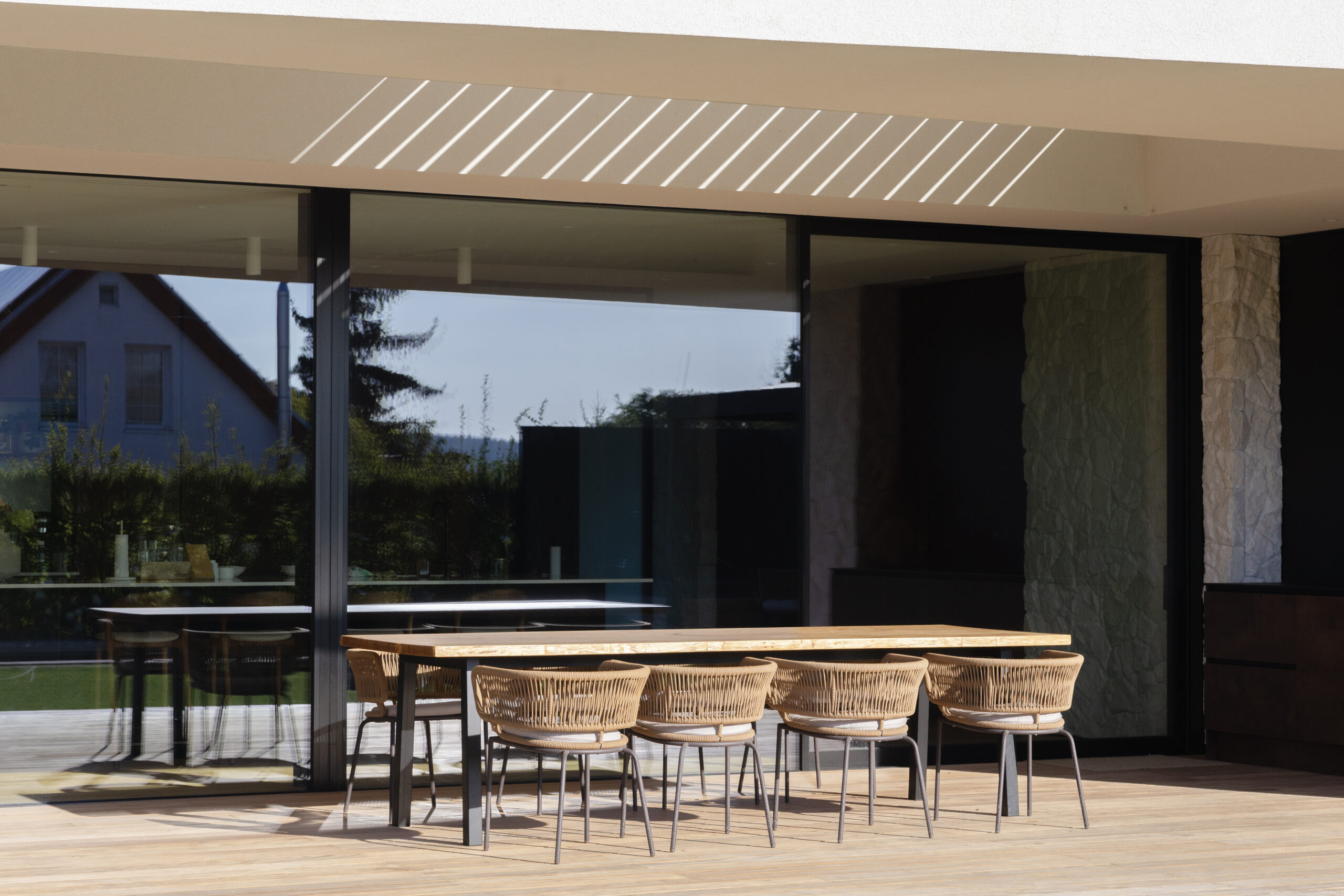 Dominantní architektonické linie, rozsáhlé prosklené plochy a propojení interiéru s exteriérem vytvářejí harmonické a světlé prostředí. Na stavbě jsme využili kombinaci moderních materiálů – pohledového betonu, hliníku a přírodního kamene, které společně podtrhují luxusní charakter domu.