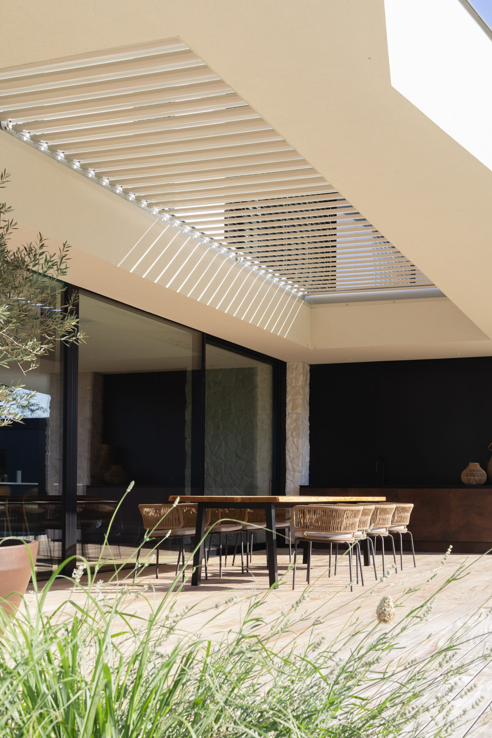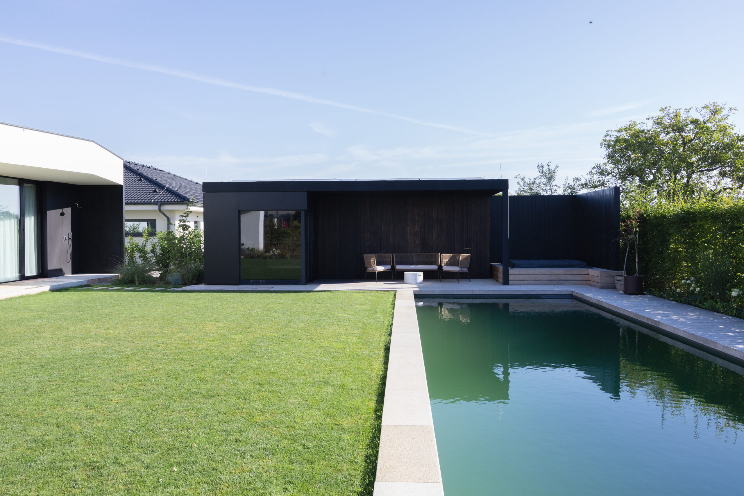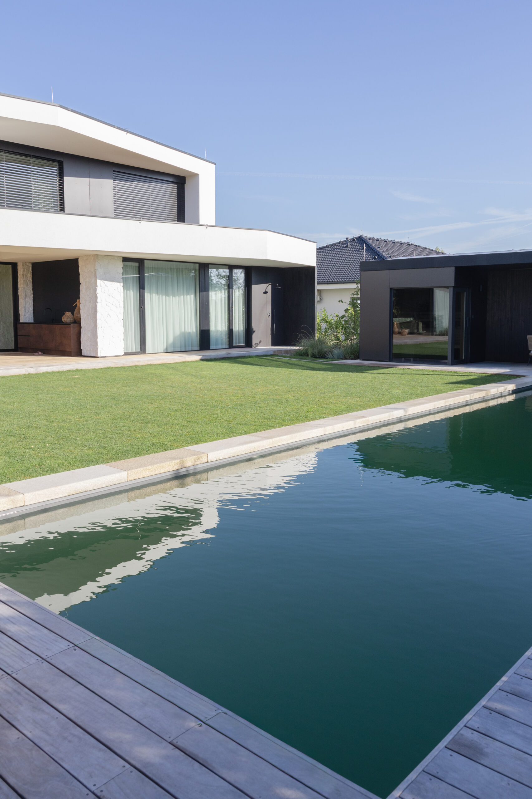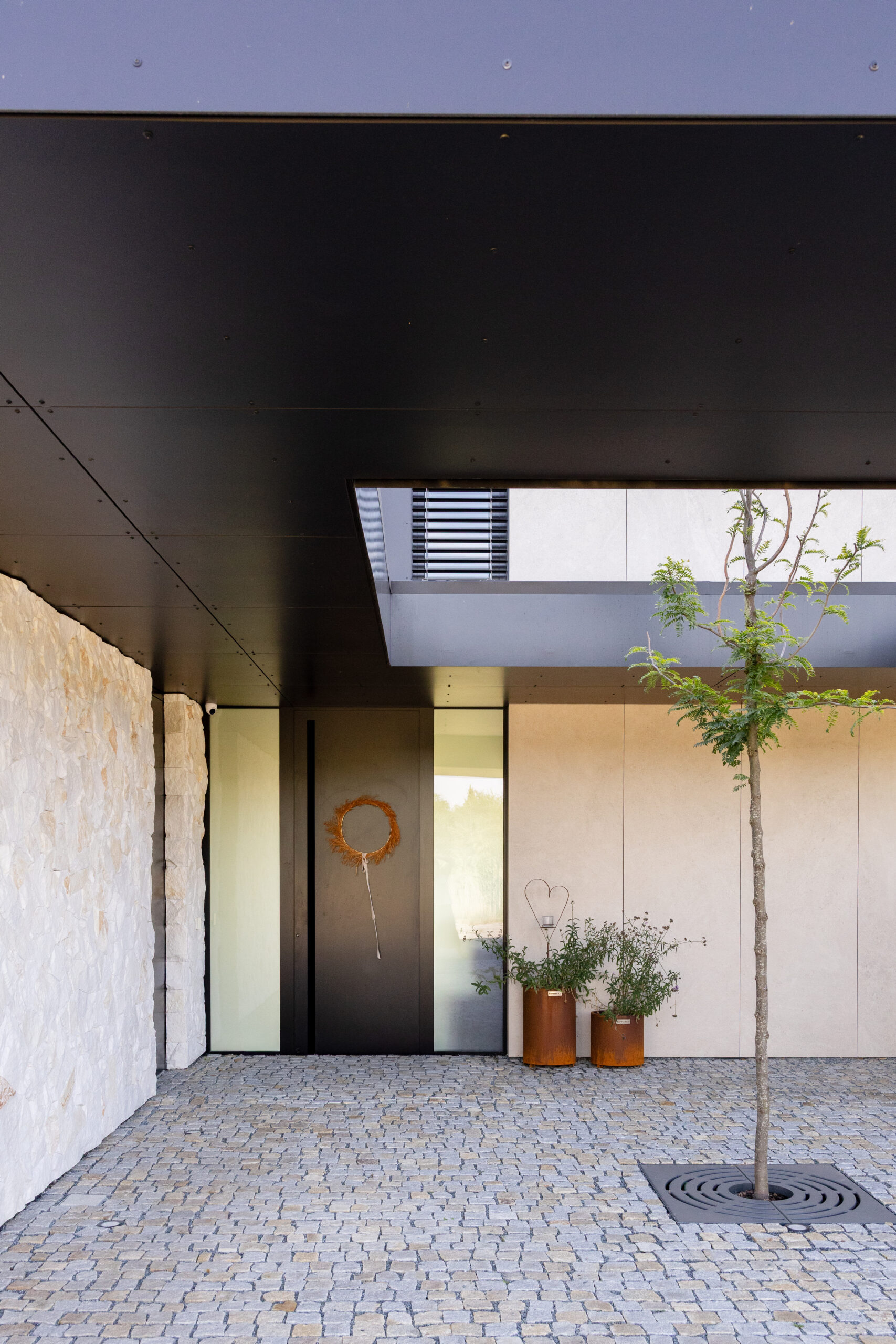 Dominantní architektonické linie, rozsáhlé prosklené plochy a propojení interiéru s exteriérem vytvářejí harmonické a světlé prostředí. Na stavbě jsme využili kombinaci moderních materiálů – pohledového betonu, hliníku a přírodního kamene, které společně podtrhují luxusní charakter domu.