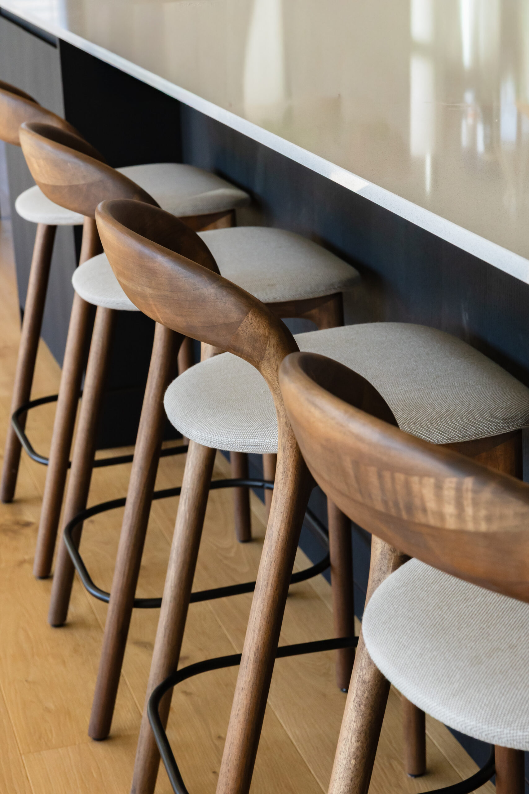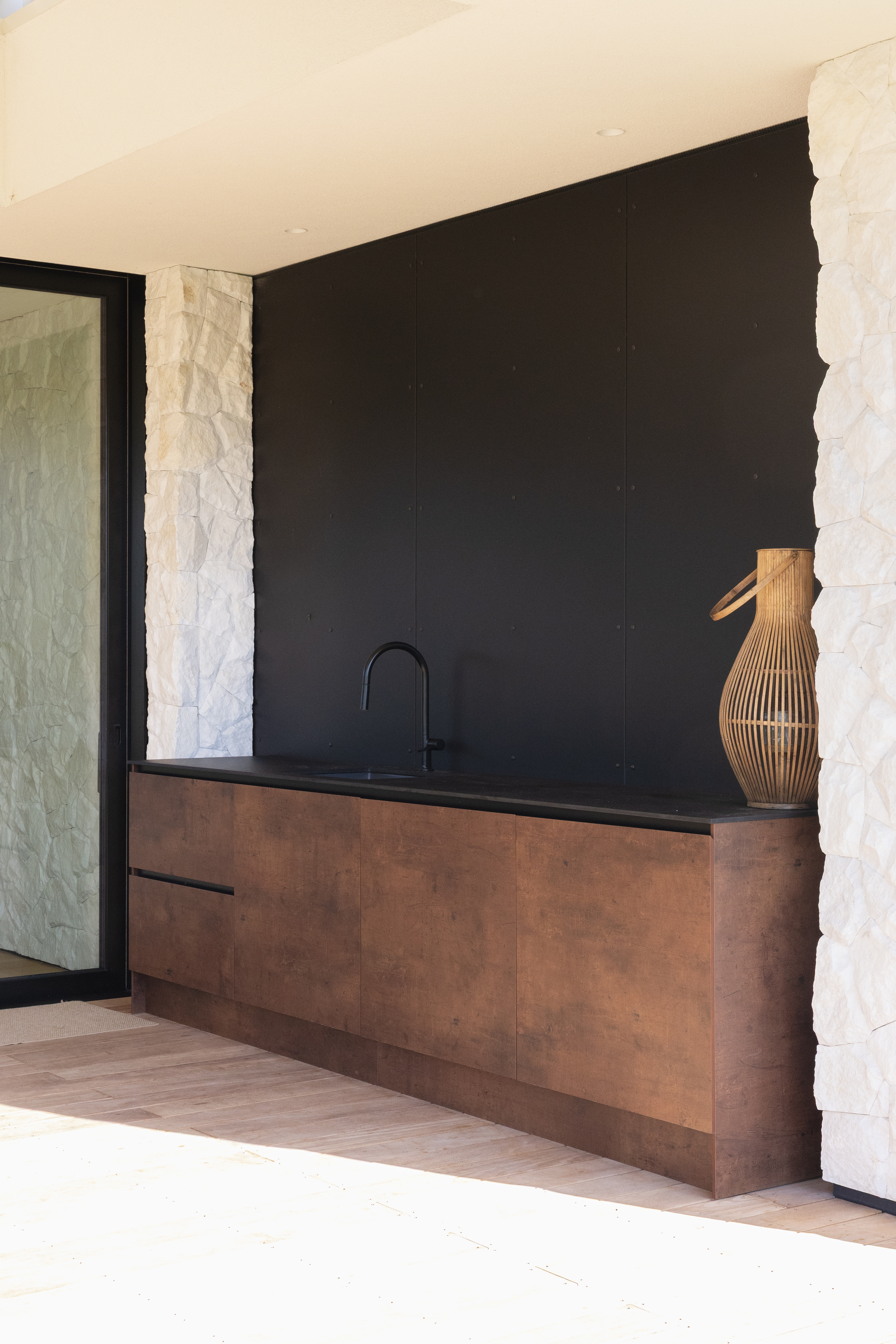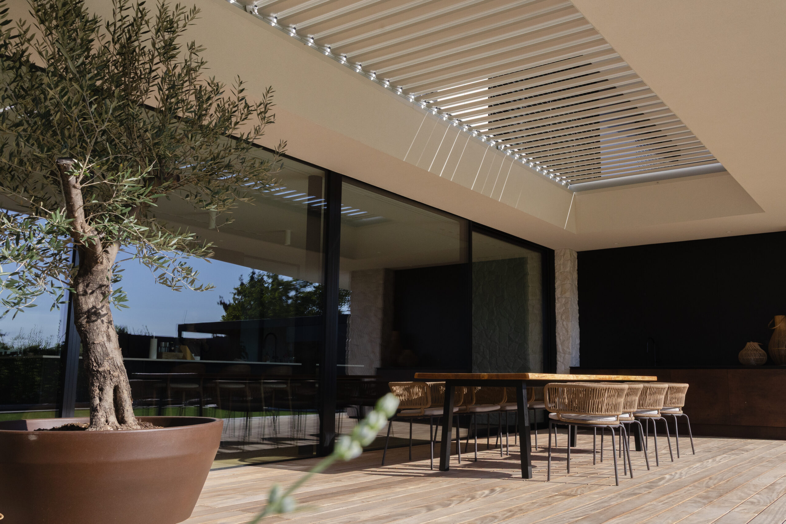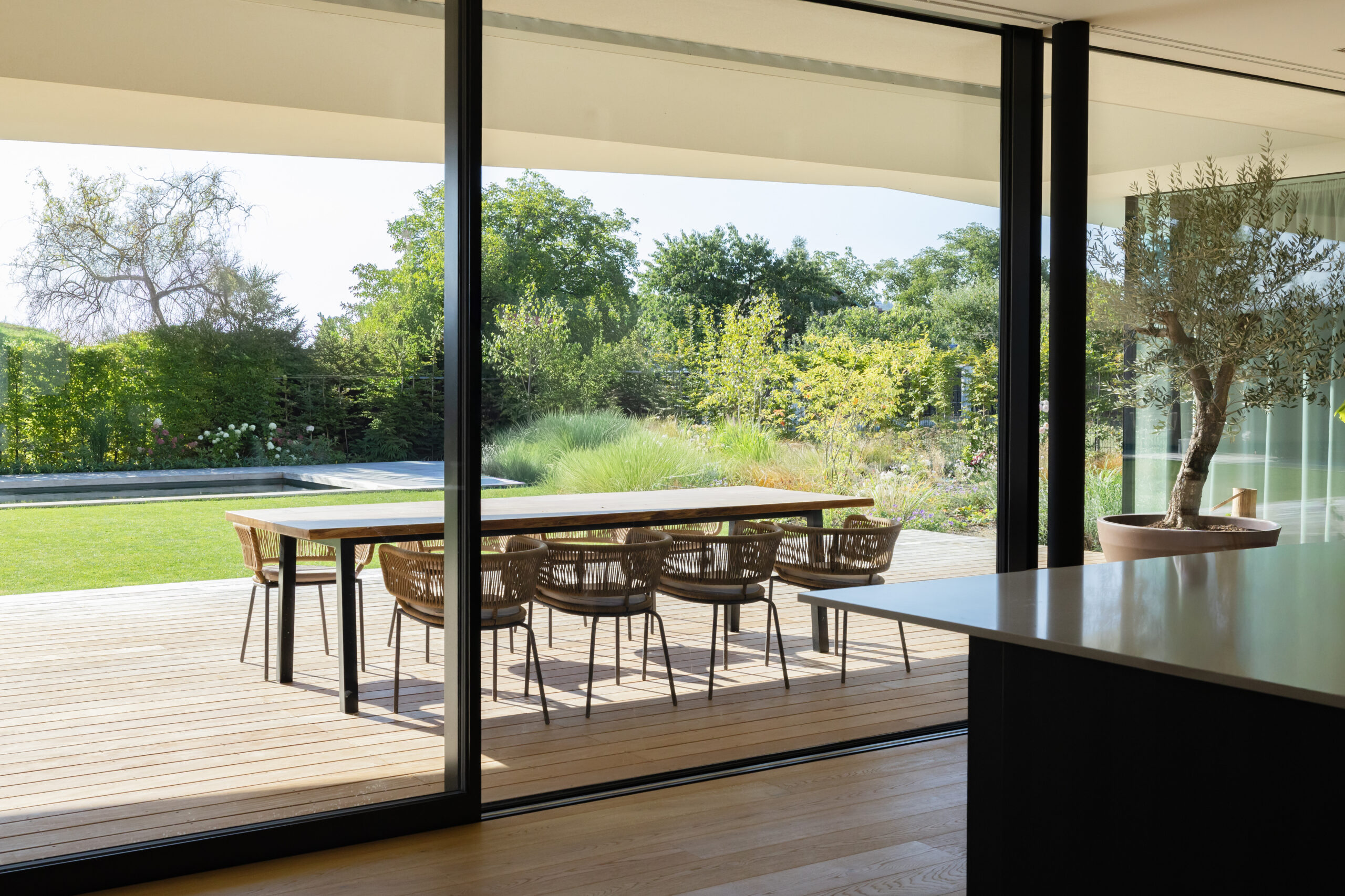 Dominantní architektonické linie, rozsáhlé prosklené plochy a propojení interiéru s exteriérem vytvářejí harmonické a světlé prostředí. Na stavbě jsme využili kombinaci moderních materiálů – pohledového betonu, hliníku a přírodního kamene, které společně podtrhují luxusní charakter domu.